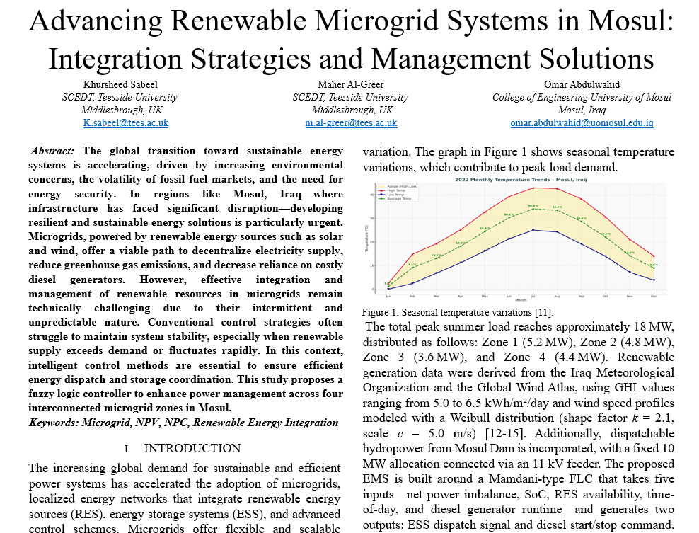 The second paper, “Advancing Renewable Microgrid Systems in Mosul: Integration Strategies and Management Solutions”, will be presented at IEEE ISGT 2025 in November.